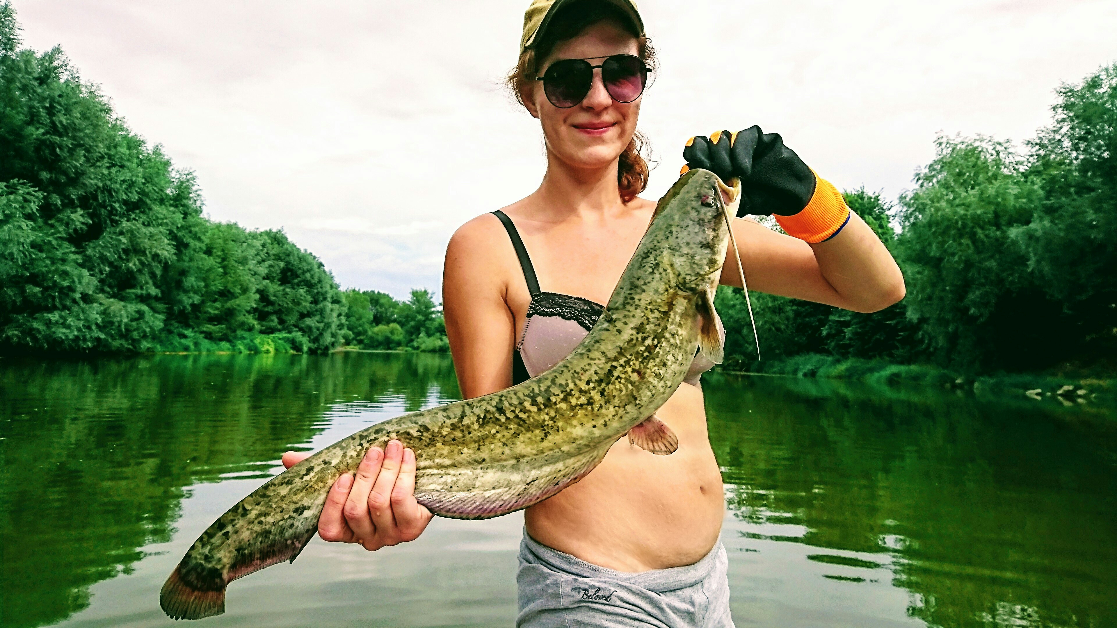 Sumec Veľký, nemeraný a nevážený, vytiahnutý, odfotený a pustený späť, pijavice, vábnička, Hron, 21.8.2017