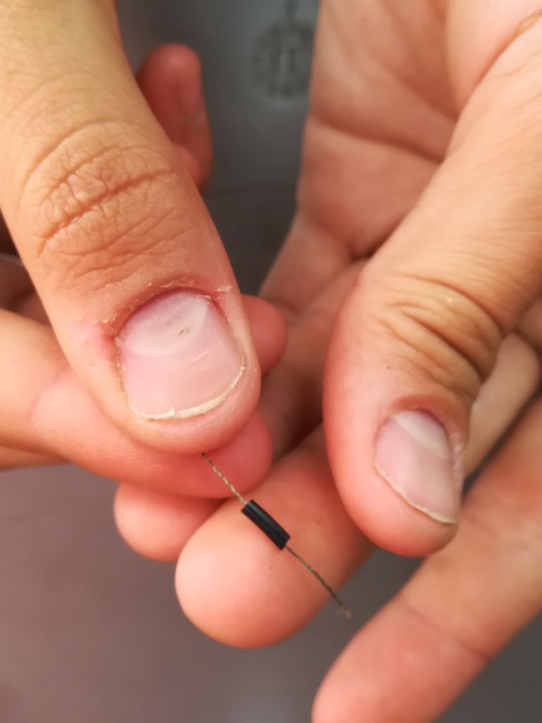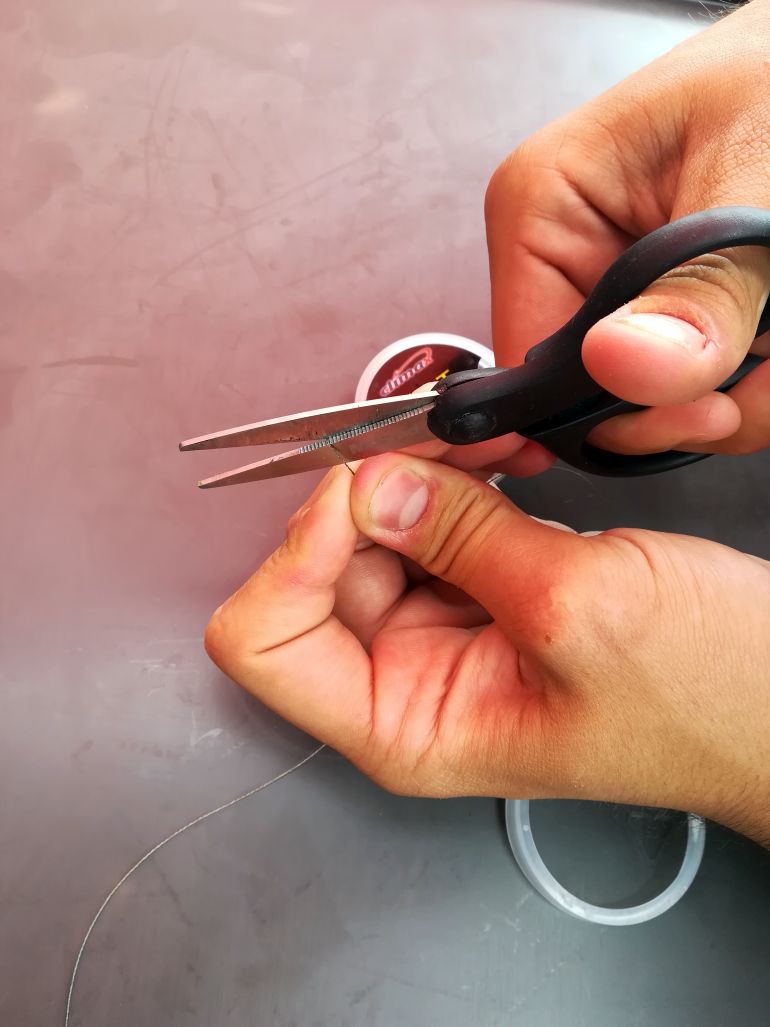 | Zoberieme si bužírku a cez menší otvor ju navlečieme na voľný koniec šnúrky. Po navlečení si odmeriame akú dĺžku vlasca potrebujeme. (Záleží od toho, na akej vode chceme chytať, ako sme spomínali vyššie) |