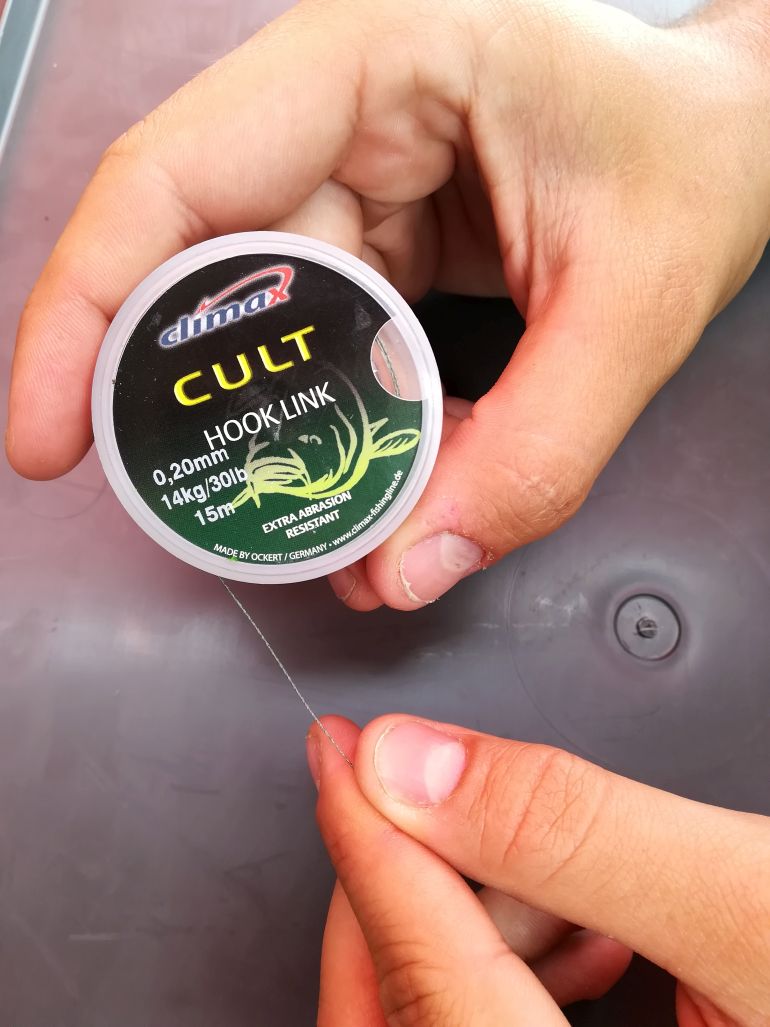 | Ako prvé potrebujeme pletenú šnúrku. Použijeme šnúrku Climax CULT Hook Link v hrúbke 0,20 mm. |