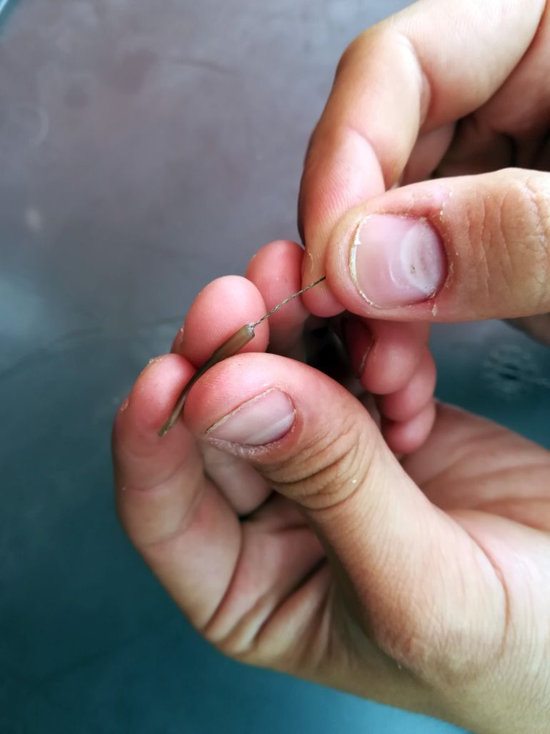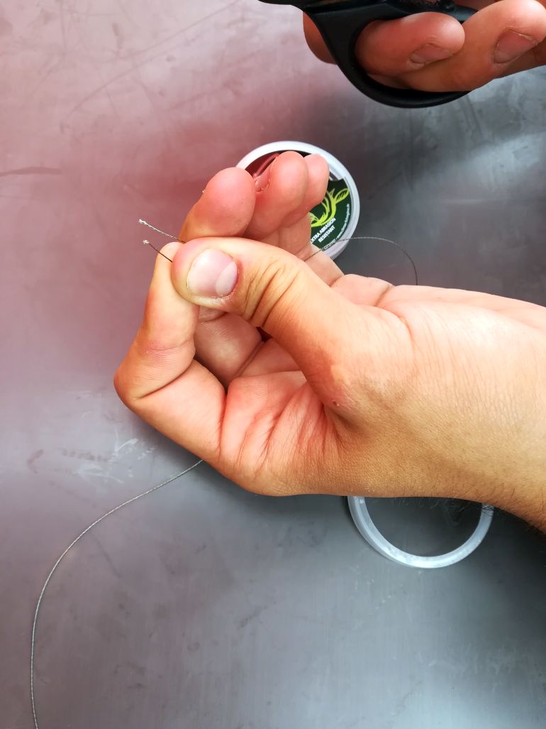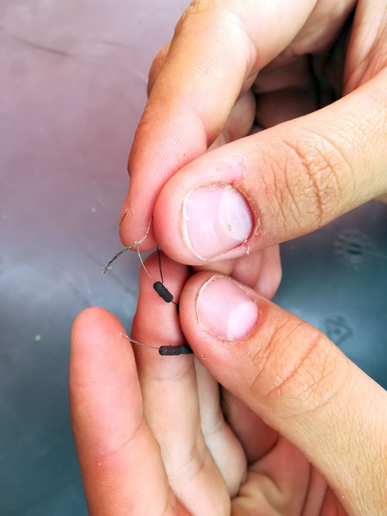 Keď už máme bužírku navlečenú na ramienku háčika, stanovíme si vzdialenosť, aká bude medzi nástrahou a háčikom.