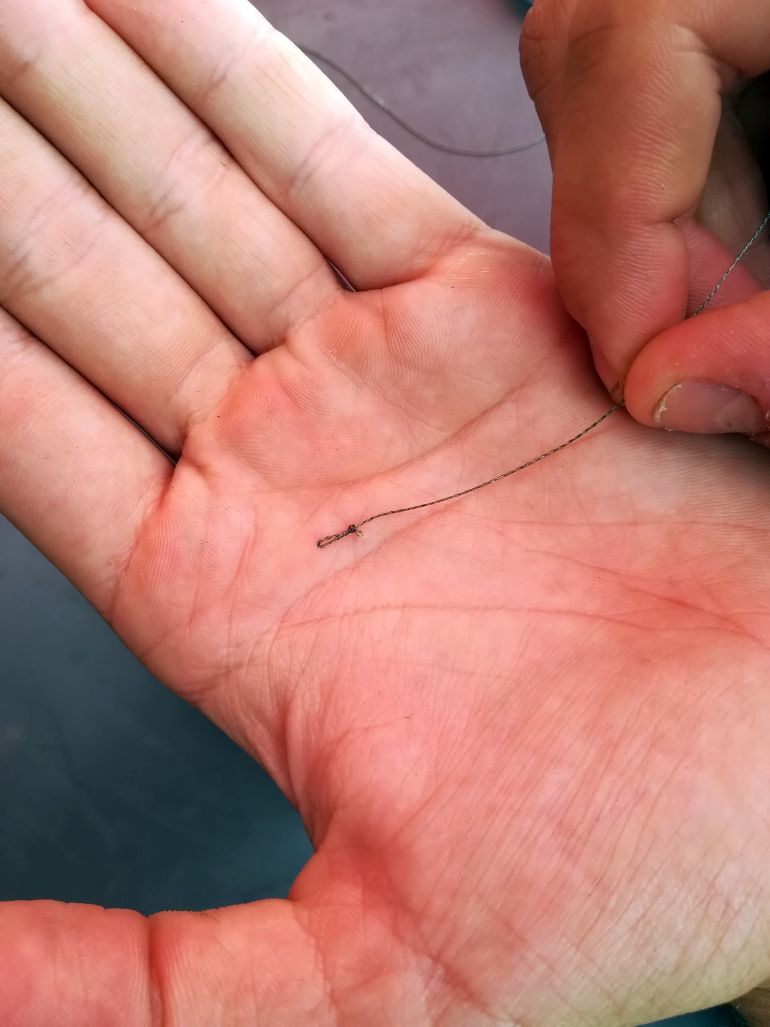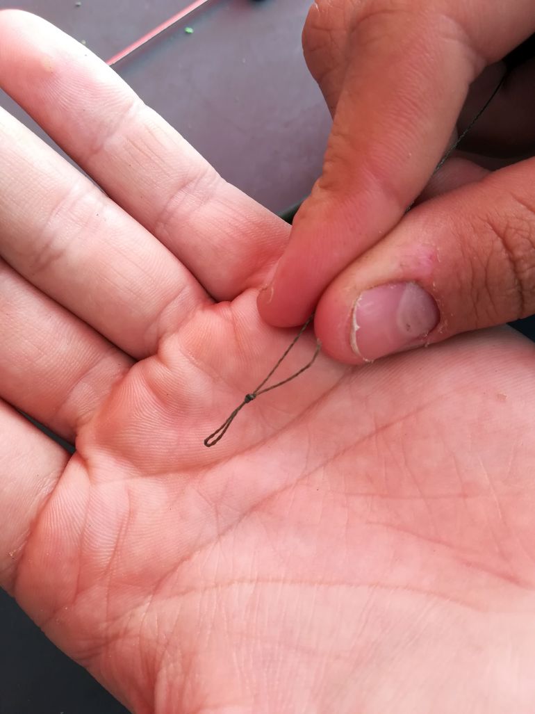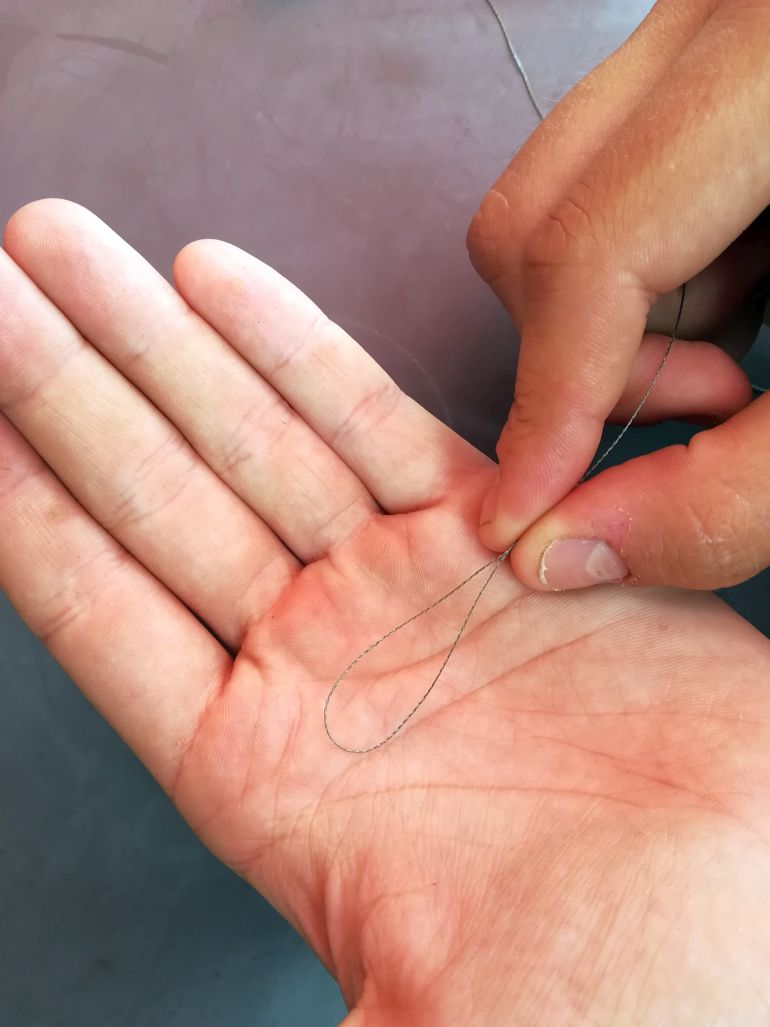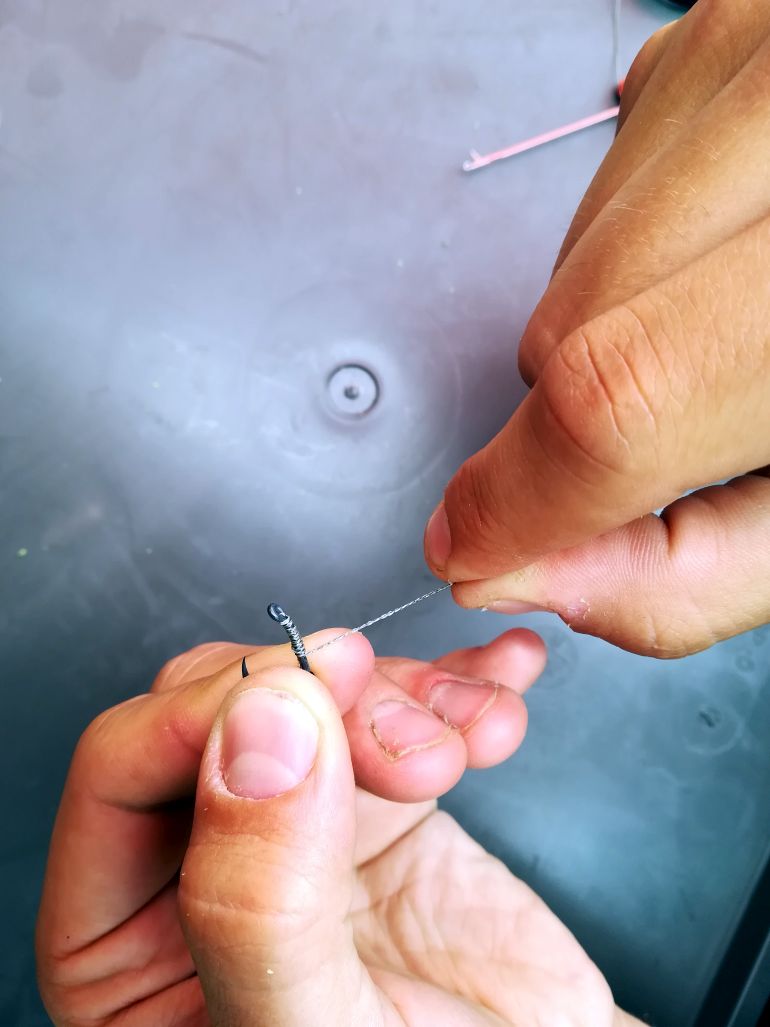 | Ako ďalšie začneme omotávať šnúrku okolo háčika. Ja dávam asi 8-10 otočiek, 2-3 otočky naspäť a potom prevlečiem volný koniec šnúrky zo zadu cez očko háčika. Navlhčím a utiahnem. |