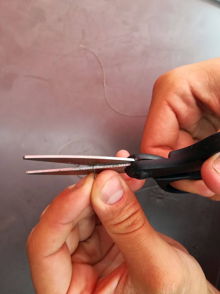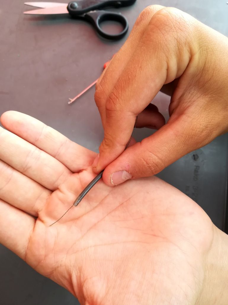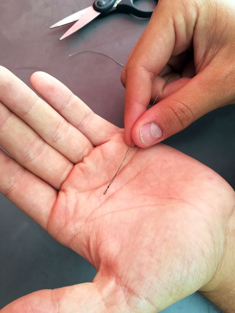 | Následne si chytíme bužírku a opatrne ju navlečieme cez hrot háčika tak, aby sme nepoškodili šnúrku. |