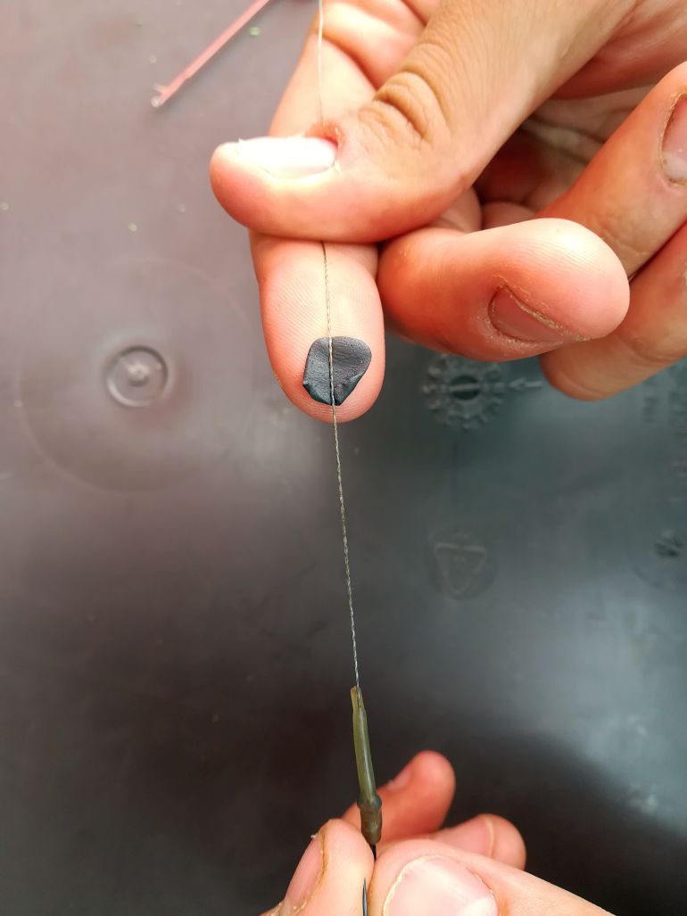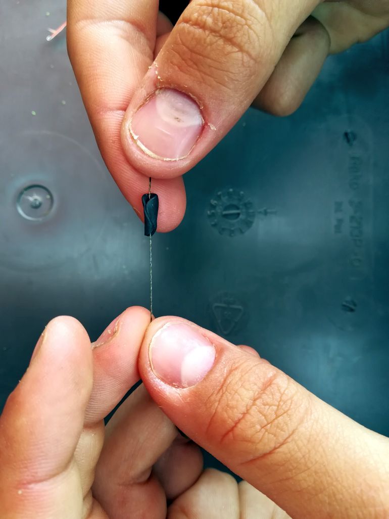 | Stoper stiahneme až k nástrahe. | Na vylepšenie nášho boiliesového nadväzca môžeme, ale nemusíme použiť bužírku. Odstrihneme si asi 0,5 cm bužírky a navlečieme si ju cez voľný koniec šnúrky až k nástrahe. |