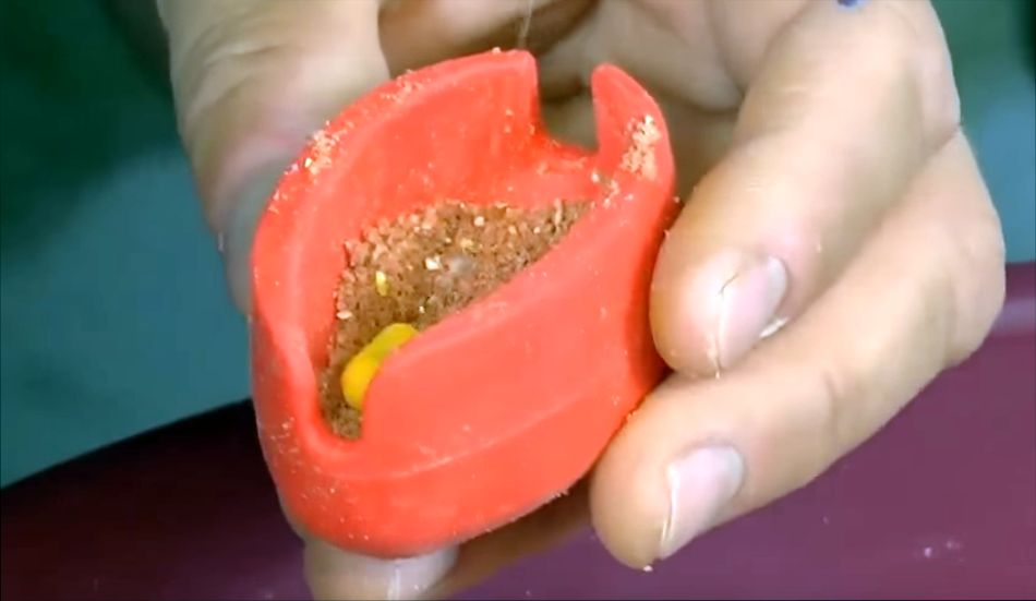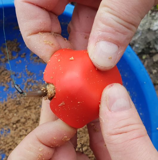 3. krok: Správny postup plnenia method feeder krmítkaDo silikónovej formičky dáme menšie množstvo krmiva (3-4mm krmiva). Vložíme nástrahu s háčikom a potom dosypeme krmivo až po vrch formičky. Tento postup je vhodné dodržať vždy. "Vždy je dobré, ak je peletka vnútri krmiva, aby nám netrčala von. Pri dopade na hladinu by sa nám mohlo stať, že by nám z krmítka strhlo peletku von," prezrádza Jaro. Po dosypaní krmiva vložíme do formičky krmítko a silným tlakom dvoch palcov vtlačíme krmítko do formičky. Ako posledný krok nasleduje vytlačenie krmítka s krmivom z formičky. |