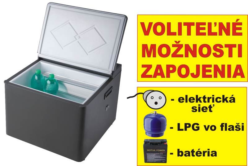 Udrží potraviny v chladnom stave na rybačke, stanovačke alebo na chate aj pri vysokých vonkajších teplotách. Pripojenie: k el. sieti 230V, na batériu 12V alebo LPG fľaše plnené propánom, butánom a ich zmesí. Chladí ticho, nevyžaduje údržbu. Objem 42L.