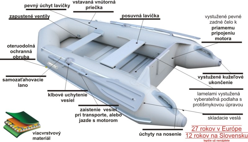 Všetký nafukovacie člny sú vyrobené z viacvrstvového materiálu pozostávajúceho z tkaného syntetického materiálu (polyester) s obojstranným polyvinylchloridným pokrytím s vysokou odolnosťou voči oderu a mechanickému poškodeniu. Vlastnosti materiálu od SPORTEX (5 vrstvový PVC s prekladanými zváranými švami) zaručuje dlhú životnosť, vzduchotesnosť a ochranu pred vonkajšími vplyvmi, ako je teplo a chlad, UV žiarenie, slaná voda, olej a palivá. Plastifikačná prísada je materiál veľmi elastický, čo je obzvlášť užitočné v prípade skladania a rozkladania člna pri nízkych teplotách. Dostupné sú dve farebné prevedenia: zelená, alebo šedá.