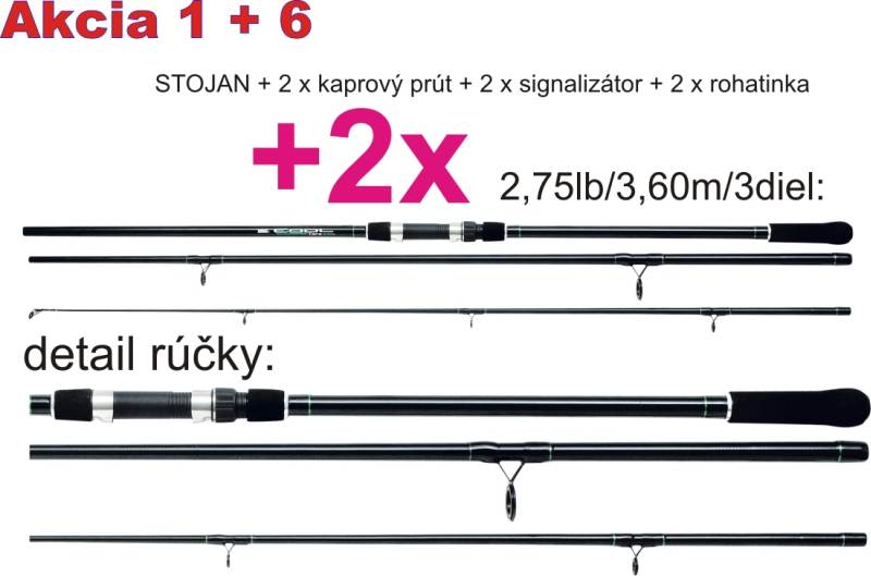 Neprehliadnuteľná AKCIA, ktorej súčasťou sú dva kaprárske prúty 3,60m dlhé/2,75lb/3 diely, kovový tripod - stojan na prúty, dva signalizátory záberu a dve zadné rohatinky, to všetko za skvelú cenu.