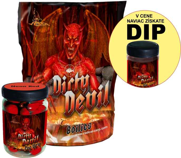 Dip v aróme Dirty Devil na zvýšenie efektivity nástrah. Dip je aromatický hustý sirup ktorý zvyšuje atraktívnosť nástrahy ako sú boilies, pelety alebo Pop Up a je neodmysliteľná výbava správneho kaprára. Dip sa postupne uvoľňuje a tvorí pachovú stopu. Dip je nenahraditeľný pri love medzi rastlinami, na zarastených vodách, a prechytaných rybárskych revíroch.