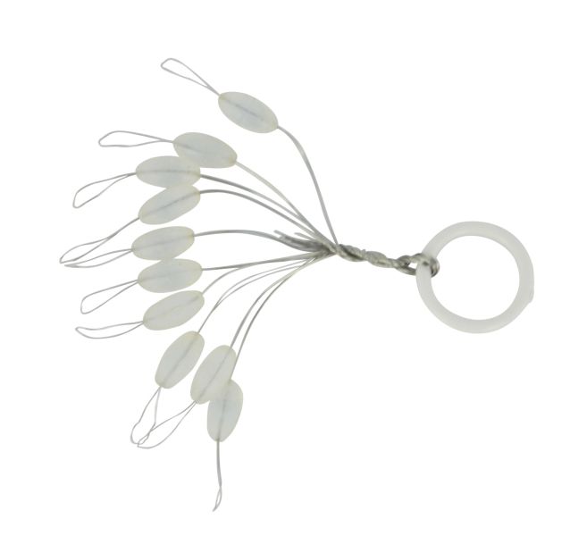 Robustné silikónové zarážky – oválne pre zaistenie sumcových plavákov, na ochranu uzlov a pod. Sú navlečené na drôtikoch s očkom čo uľahčí natiahnutie na silon alebo šnúru.