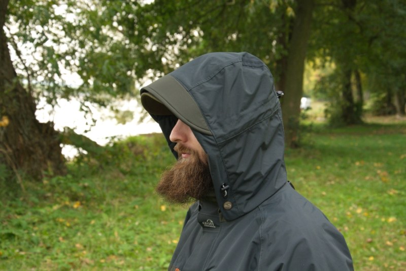 Predná časť kapucne je tvarovateľná s nastaviteľnou manžetou okolo tváre zabraňuje unikaniu tepla a 3D jednodotykové nastavovanie s vysokým golierom zabraňuje vnikaniu vody a chladu aj pri silnom vetre. Možnosť pevne uchytiť bundu Hoody alebo Thermal, ako dalšiu hrejivú vrstvu.