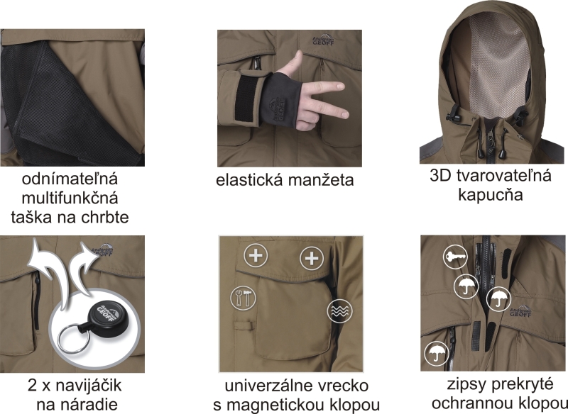 Ideálne využitie pre Rybolov, lov pstruha, muškárenie, brodenie, prívlač,vyvinutá špeciálne jako bunda na vysoké brodiace čižmy prsačky – ocení každý slovenský rybár . Využiteľné aj ako outdoor oblečenie , cykloturistika, pracovné oblečenie, bežné denné nosenie
