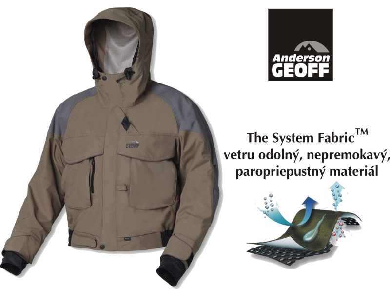 Membránová bunda z materiálu The System Fabric, vodný stĺpec 5000mm, hnedo šedá farba, vode a vetru odolná bunda s voľným strihom a kapucňou, má vodotesné vrecká , rukávy majú manžety proti vniknutiu vody. Vhodná pre rybolov – na brodenie.