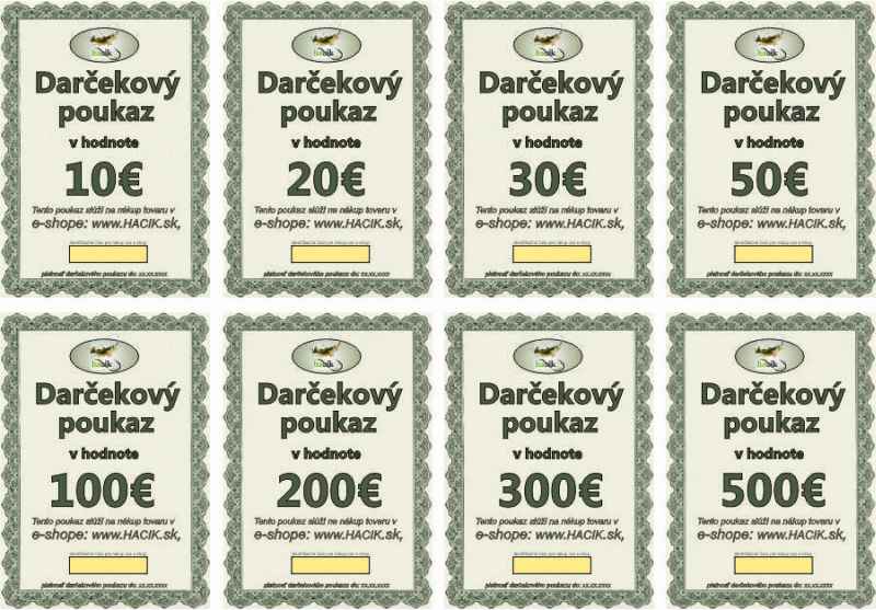 Ako to funguje? Do košíka vložíte darčekový poukaz vo vybranej hodnote, prípadne počet kusov. Poukaz obdržíte v zásielke. Váš obdarovaný rybár si tento poukaz môže uplatniť nasledovne: Pri objednávke v E-SHOPE hacik.sk vloží unikátny kód a hodnota poukazu sa mu odpočíta z celkovej sumy nákupu.