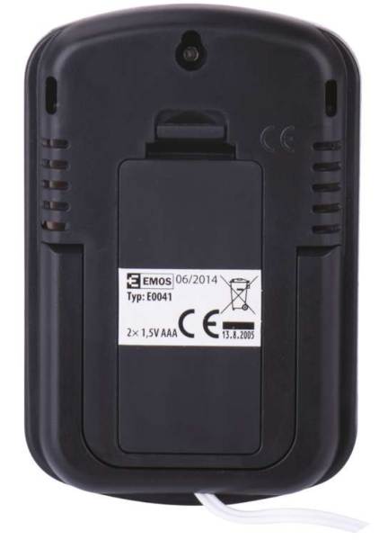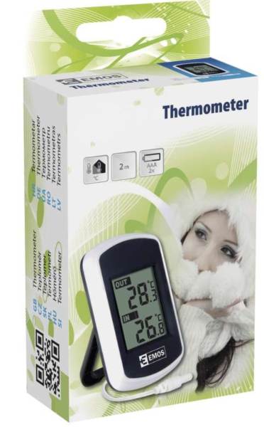 Meria vonkajšiu a vnútornú teplotu v rozsahu od -40 do +60°C. Napájanie 2xAAA. Zavesenie na stenu + stojan na pevnú podložku