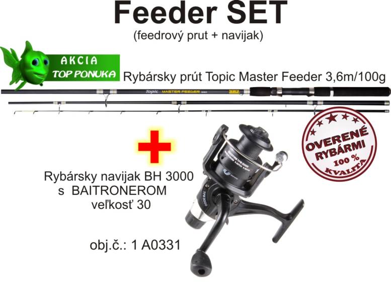 Set pre každého náročného rybára, ideálny však aj ako rybársky darček, teraz za fantastickú cenu! V balení trojdielny feeder prút s navijakom a namotaným extra silonom. Len do vypredania zásob! Balenie obsahuje: 1ks Prút Topic Master Feeder - 3,6m 1ks Rybársky navijak - dvojbrzdový BH 3000 Topic Master Feeder Feederový prút v modernom dizajne a vyrobený z kvalitného materiálu. V trojdielnom prevení je deálny na väčšie vzdialenosti, no s mäkkou špičkou aj na krátke vzdialenosti osadený so SIC očkami. Prút pokryje všetku vašu spokojnosť ak chcete použiť len jeden prút na viacero rozlične tažkých návnad, s ľahkosťou možete nahadzovať aj väčšie krmítka. Parametre: - dĺžka prútu 3,6m - záťaž - 100gram - transportná dĺžka 1,25m - počet dielov 3 - dodávané s dvoma špičkami Rybársky navijak - dvojbrzdový BH 3000 Navijak vhodný na prívlač a feeder. Troj ložiskový systém s dvojitou brzdou zaručuje spoľahlivosť aj pri veľkej záťaži. Navijak ma rýchlo sklopnú rúčku a protivibračný systém. Parametre: - 3 ložiskové prevedenie - Veľkosť: 30 - kapacita 0,20mm/260m; 0,28mm/135m; 0,30mm/115m - rýchlosklopná kľučka - aNTI TWIST systém - grafitová cievkaAkcie