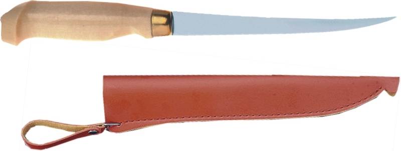 Veľmi ostrý filetovací nôž s 15cm čepeľou z nehradzavejúcej ocele a s drevenou rukoväťou. Kožené puzdro s prackou na opasok. Výrobok od rybárov pre rybárov