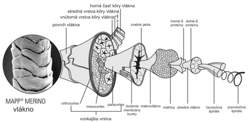 Vlnené vlákna Otara™ Merino majú komplexnú štruktúru s hydrofilným (vodu zadržujúcim) vnútorným prostredím známym ako kôra a hydrofóbnym (vodu odpudzujúcim) vonkajším prostredímvonkajšou kôrou, známym ako pokožka.