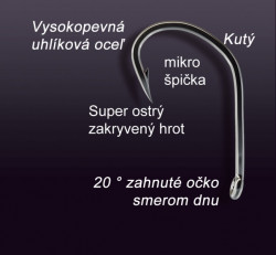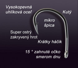 Pevný háčik s teflónovou úpravou, dlhým ramienkom, očkom a protihrotom. Používa sa pri love bielych a kaprovitých rýb vlasovou metódou. Ako nástrahu je možné použiť boilies, pelety a rôzne prírodné nástrahy. Vhodný aj na pop up systémy.