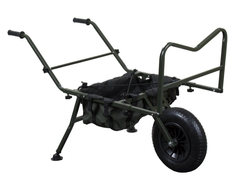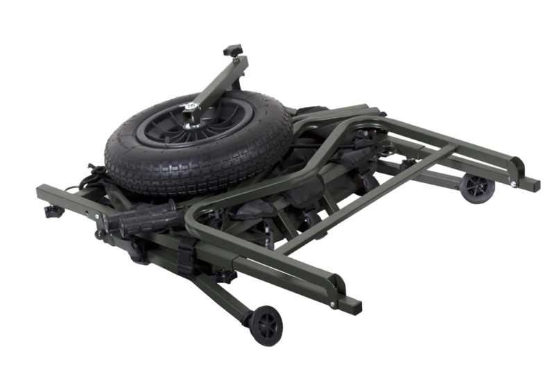 Skladací vozík s jedným kolečkom na prepravu rybárskeho náčinia extra vybavený s gumovým popruhom na zaistenie prevážaných predmetov. Jednoducho si prepravíte svoje rybárske náčinie na lovné miesto k vode.