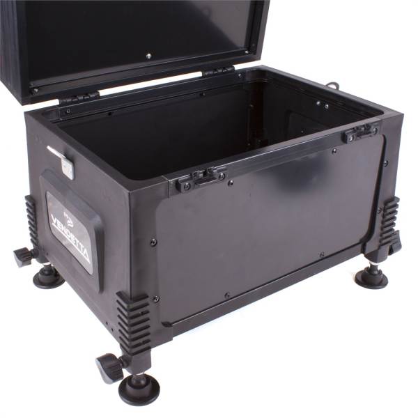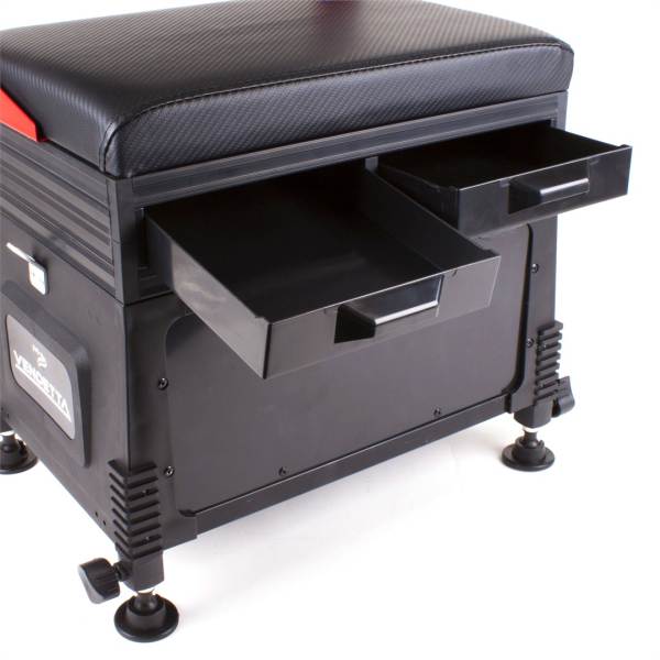 Moderný sedací box s popruhom na prenášania s dvoma prednými zásuvky a výklopnou mäkkou vrchnou časťou na sedenie, ktorá zaručuje dostatok miesta pre všetok rybársky materiál. Jednoduchý sedací box vybavený nastavovacími nožičkami s bahennými koncovkami.