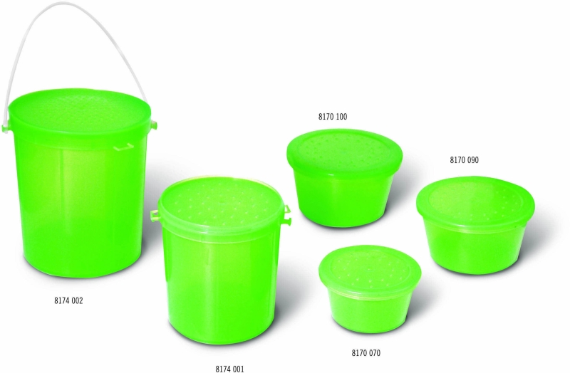 Plastová krabica v zelenej farbe s perforovaným vrchnákom na rôzne typy živých nástrah – červov, kostných červov a dážďoviek.