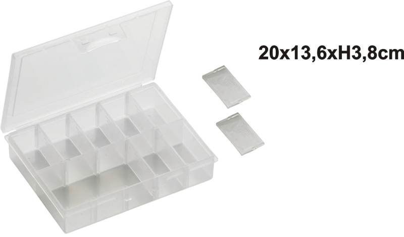 Plastová krabička na drobné rybárske doplnky alebo na nástrahy, vybavená posuvnými a vyberatelnými priehradkami na prehľadné rozloženie drobného rybárskeho príslušenstva.