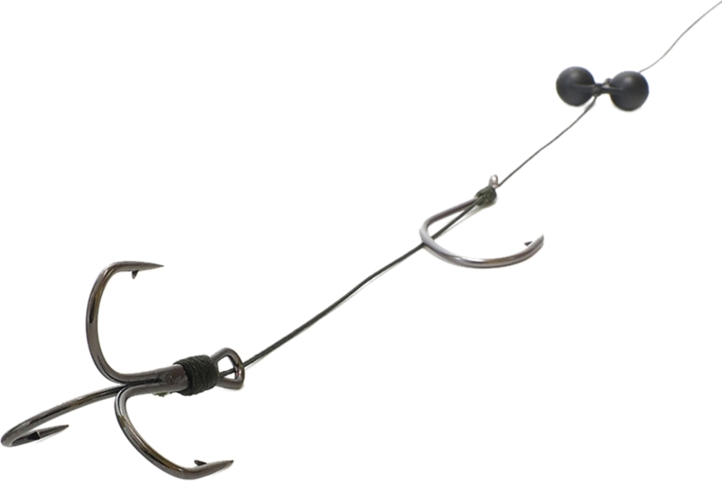 Hotový nadväzec na lov sumcov. Pevný sumčiarsky trojháčik a jednoháčik sú naviazané na odolnej šnúre. Gorálka dráždi sumce.