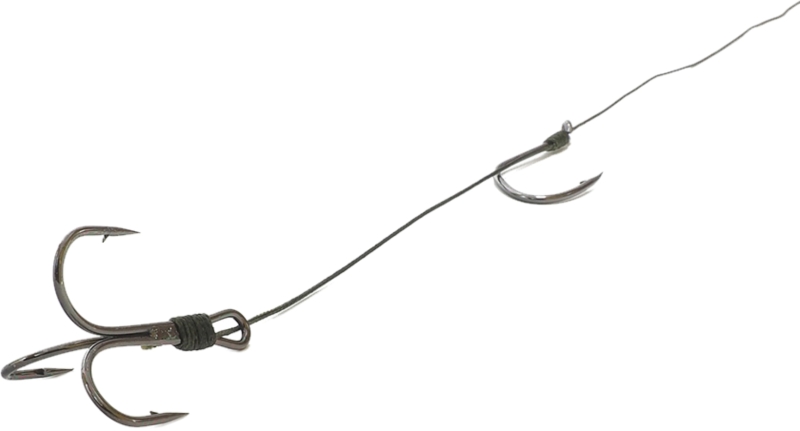 Hotový nadväzec na lov sumcov. Pevný sumčiarsky trojháčik a jednoháčik sú naviazané na odolnej šnúre.