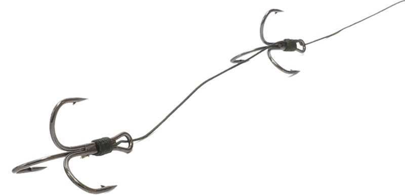 Hotový nadväzec na lov sumcov. Na odolnej šnúre sú naviazané dva pevné sumčiarske trojháčiky.
