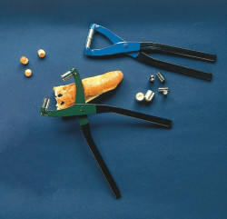 Praktické kliešte z nerezu s gumenými rukoväťami. Súčasťou balenia je 100 ks kovových spojok v piatich priemeroch.