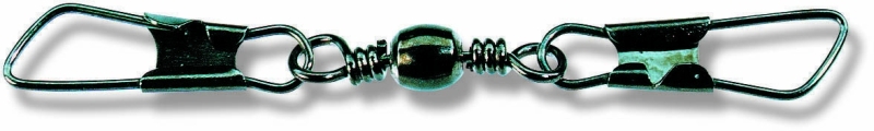Obratlík s dvomi karabínami z leštenej mosadze. Používa sa pri výrobe rôznych rybárskych montáží a na rýchle spojenie nadväzcov.