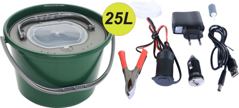 Okysličovač napájaný na 230V, 12V akumulátorom, AA batériami alebo cez USB spolu so 25l vedrom na živú nástrahu za výhodnú cenu