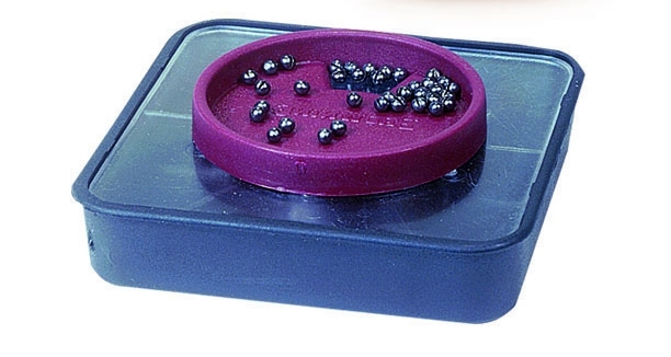 Sada sekaných olovených brokov v siedmych veľkostiach a váhach v praktickom plastovom zásobníku s otočným viečkom.