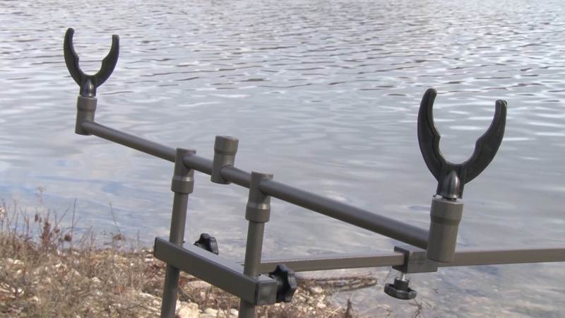Detailný záber na zadnú časť stojanu a podbierkami na udice umiestnené na pevných rohatinkách tohto stojanu ktorý vám ponúkame