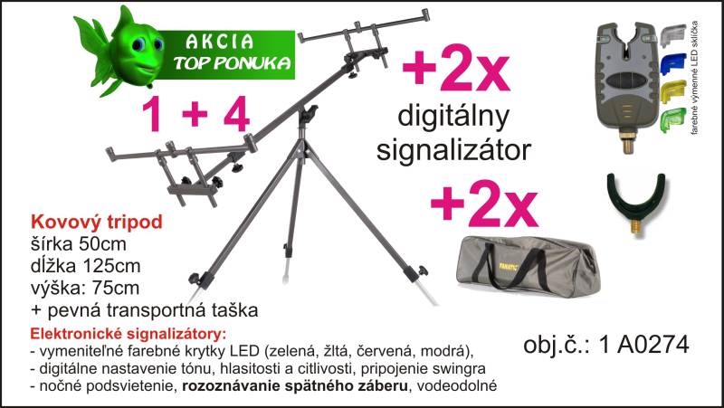 Rybársky veľký kovový tripod šírka: 50, dĺžka:125, výš:75cm s flexibilným nastavením výšky a sklonu s pevnou konštrukciou. V najlacnejšom sete získate 2 ks digitálnych signalizátorov na 9V s nastaviteľným tónom, citlivosťou a hlasitosťou + 2ks rohatiniek.