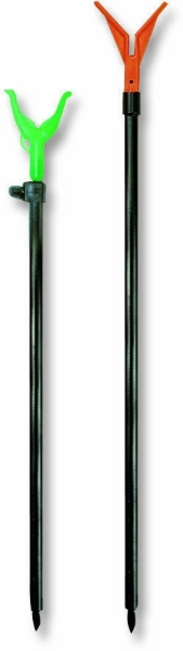 Kovová teleskopická podpierka s plastovou hlavicou a výrezom na vlasec. Výšku nastavujeme pomocou aretovacej skrutky. Dá sa dobre zapichnúť aj do tvrdého podkladu.