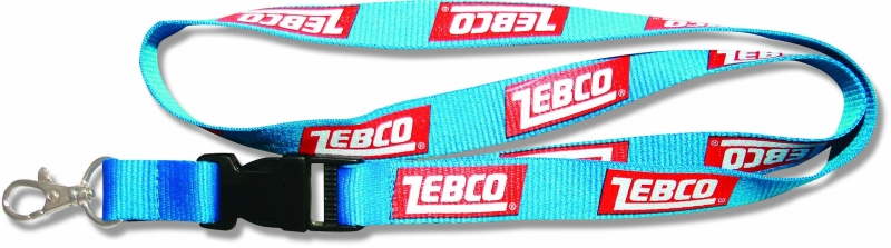 Popruh z nylonu, farbený s potlačou, logom Zebco a pevným klipom na kľúče.