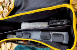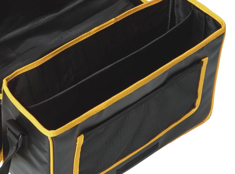 Praktická a funkčná rybárska taška s kvalitným PVC povrchom ochráni vaše vybavenie pred vlhkosťou. Tento povrch pred konkurentmi vyniká v jednoduchosti čistenia. Hlavná priehradka je rozdelená do dvoch častí, do ktorých si uložíte samostatné boxy s nástrahami. Na prednej strane sa nachádza vrecko zo sieťoviny na uloženie klieští, peánu a iného rybárskeho príslušenstva. Samozrejmosťou je pevný ramenný popruh na prenášanie.