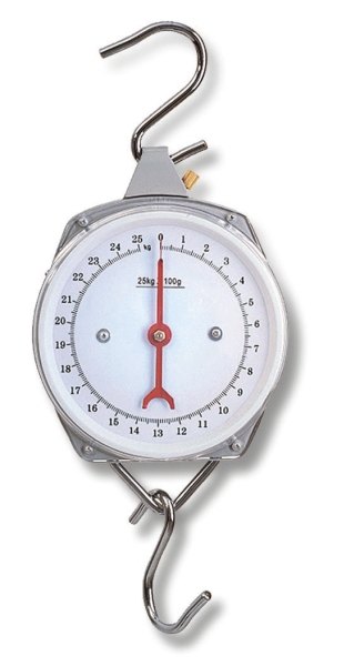 Pružinová váha na váženie úlovkov s veľkým ciferníkom s plastovým krytom a dvomi nerezovými hákmi. Delenie ciferníka je po 100 g. Váha sa dá zavesiť.