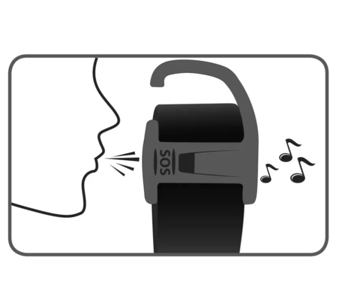 Pre prípad krízovej situácie je na popruhu umiestnená SOS píšťalka.