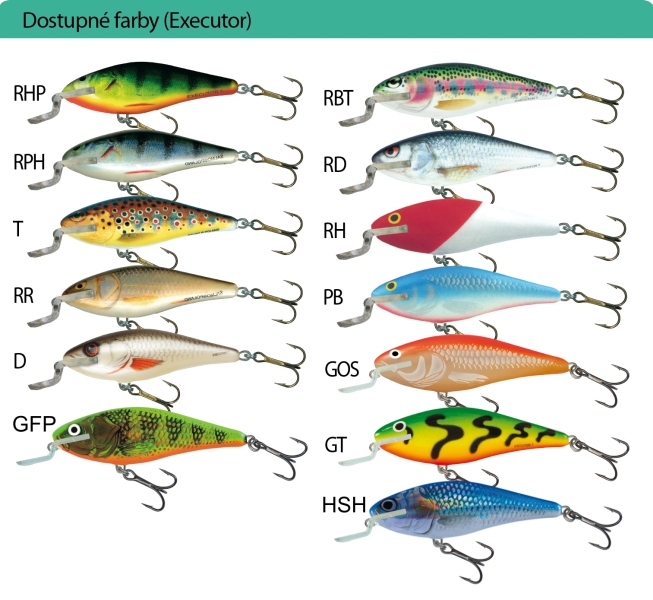 Wobler SALMO EXECUTOR, dĺžka 12 cm, váha 33 g, plávajúci, hĺbka ponoru 2,5/5,0 m, štíhly wobler v tvare rybky s agresívnym a plynulým pohybom, má 2 trojháčiky č.1/0, výborný na lov dravcov v jazerách, aj trollingom.