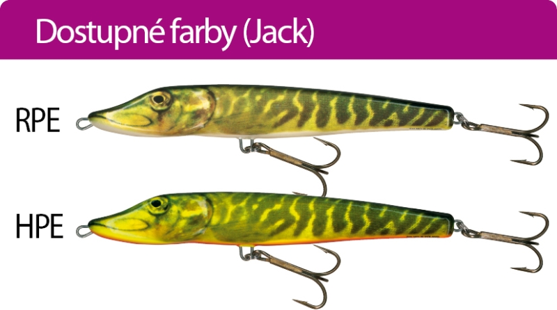 Wobler SALMO JACK, dĺžka 18 cm, váha 60 g, plávajúci, hĺbka ponoru 1,0/1,5 m, hladinový wobler v tvare šťuky dokonale imitujúci poranenú rybu, má 2 trojháčiky č. 4/0.