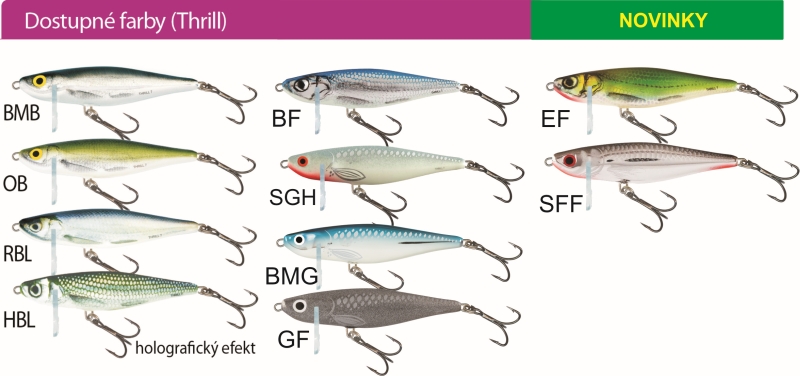 Wobler SALMO THRILL, dĺžka 5 cm, váha 12 g, hladinový potápavý wobler vhodný na lov boleňa rýchlym ťahaním. Dá sa s ním ďaleko nahadzovať a je veľmi účinný. Imituje rybku unikajúcu pred dravcom. Má 2 trojháčiky č.5.