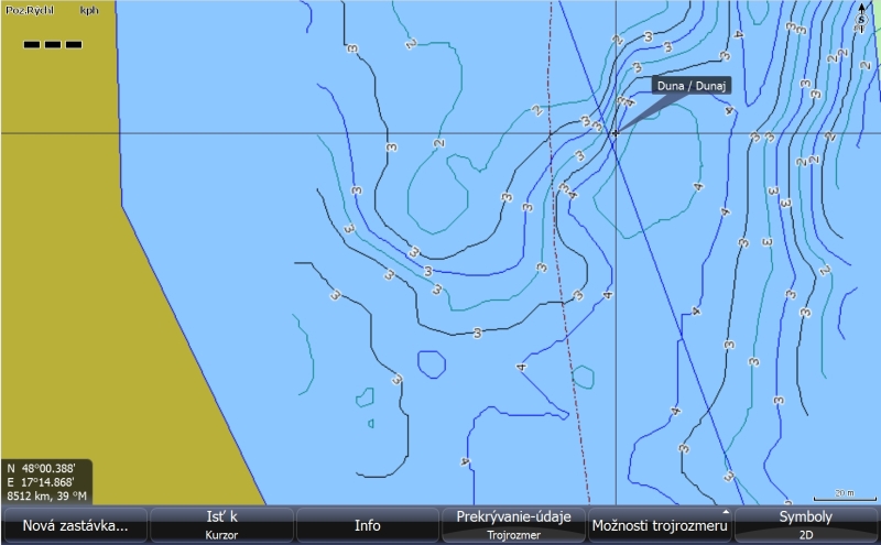 obázok Dunaja s hĺbkovými zmenami a prekážkami aj s presnou polohou
