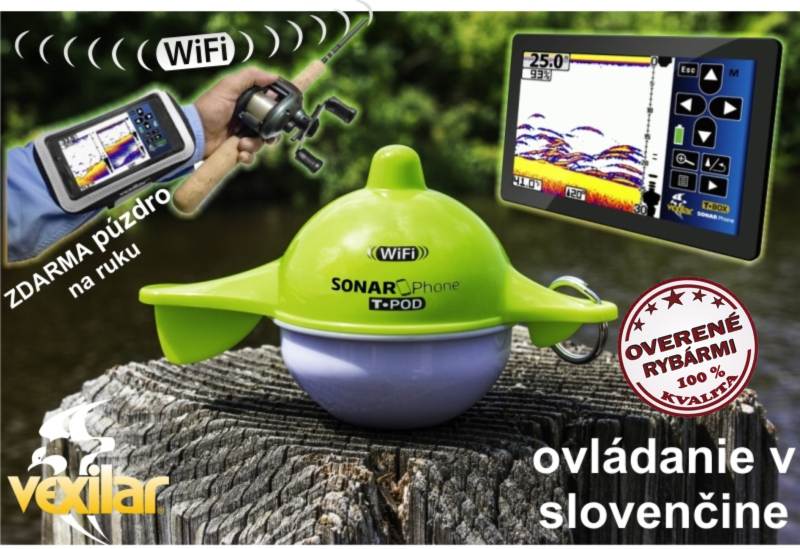Vysokovýkonný sonar pre váš smartfón alebo tablet. Vyskúšajte sonar ZDARMA-Wifi dosah neuveriteľných 91,5m, neobmedzený počet rybárov na sonde súčasne, púzdro na ruku v cene, zväčšené sledovanie dna, ovládanie SK, aplikácia zdarma: Google play, App Store.