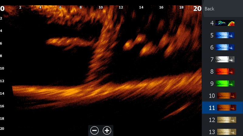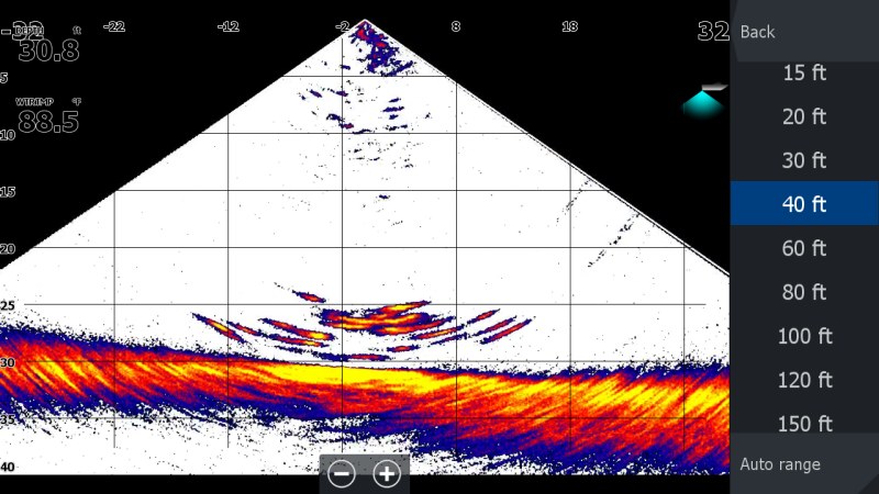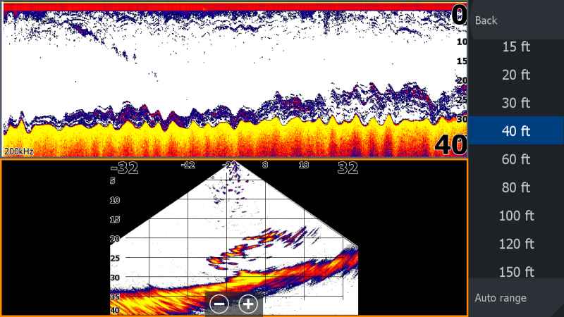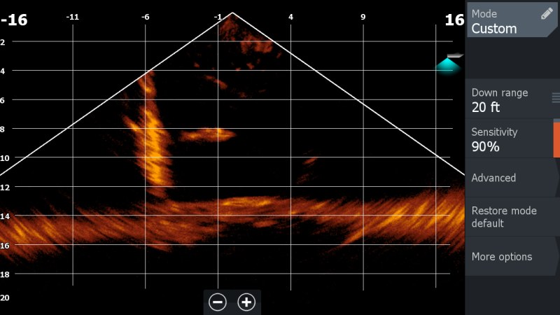 - pri natočení sondy smerom dole môžete sledovať okrem zobrazenia LiveSight aj klasické sonarové snímanie