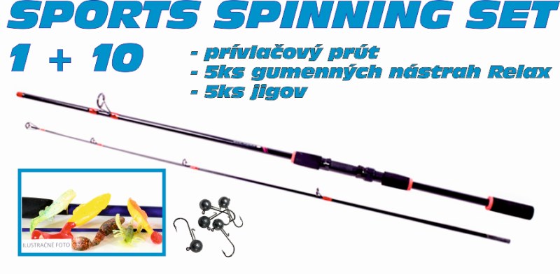 Akciový prívlačový set SPORTS Spinning set obsahuje rybársky prút, 5ks RELAX zančkových nástrah + 5ks JIG háčikov.
