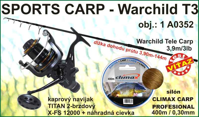 Rybársky kaprový teleskopický set: teleskopický kaprový prút WARCHILD CARP 3,9m/3,0lb + navijak s baitrunnerom: Carp Runner 12000 (11 ložisko), kovová cievka, kapacita 0,40/400m + silon. Kvalitná zostava, prút absolvoval TV test na dohod - 144m