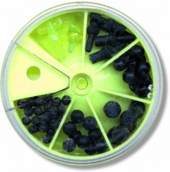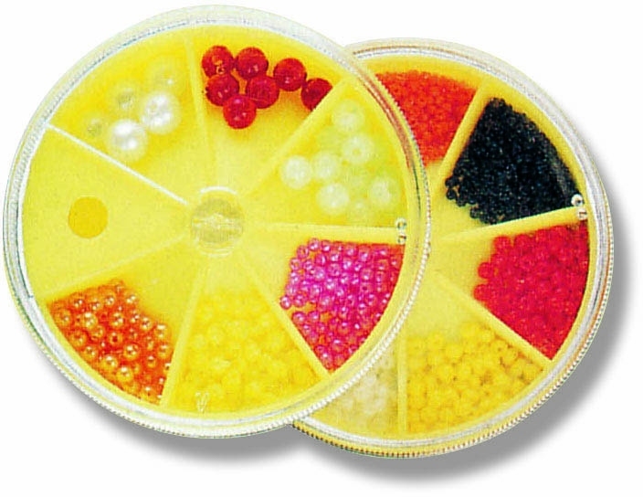 Sada plastových koráliek v rôznych veľkostiach v praktickom zásobníku. Používajú sa pri zostrojovaní rôznych rybárskych systémov na lov rýb.