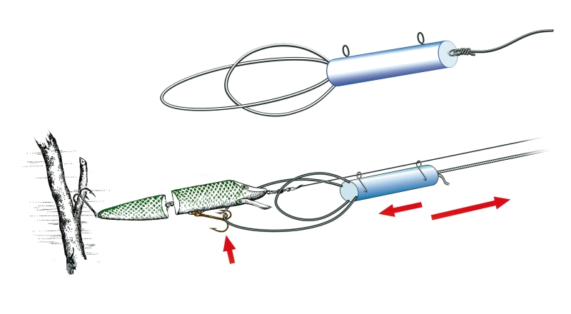 Uvoľňovač woblerov a umelých nástrah zachytených v rôznych prekážkach. Má valcovitý tvar s pevným oceľovým očkom a dvomi lankami na zachytenie nástrah